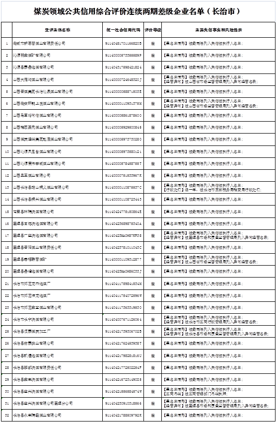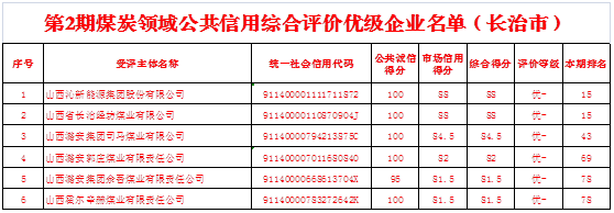 为精准开展对煤炭领域企业的分类监管,促进行业守信自律,推动提升全社会信用水平,近日,国家发展改革委组织国家公共信用信息中心和相关大数据机构,对全国19000余家涉煤企业开展了第2期公共信用综合评价。根据第2期评价结果,共计评出我市“优”级企业6家,“差”级企业32家。按照《山西省发展和改革委员会关于用好公共信用综合评价结果 切实加强煤炭行业管理工作的通知》(晋发改财金发〔2019〕32号)的要求,现将本期评价结果为“优”级和连续两次为“差级”的我省企业信息予以公告,详见附件。