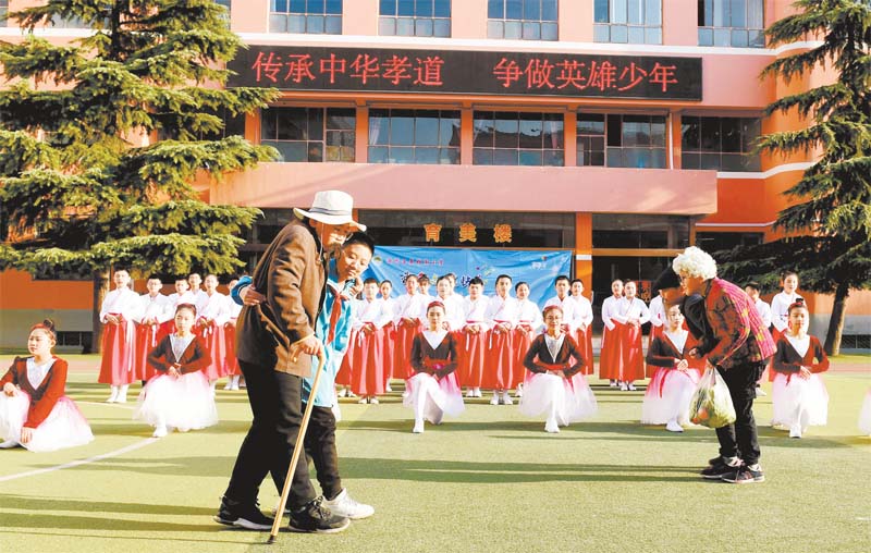 在重阳节来临之际,潞州区英雄街小学举行了“践行中华孝道,争做孝心少年”主题活动,学生们通过情景剧表演、诗词朗诵等形式,加深对“孝”的认识,传承“尊老、敬老、爱老、助老”的中华传统美德。(梁栋 摄)