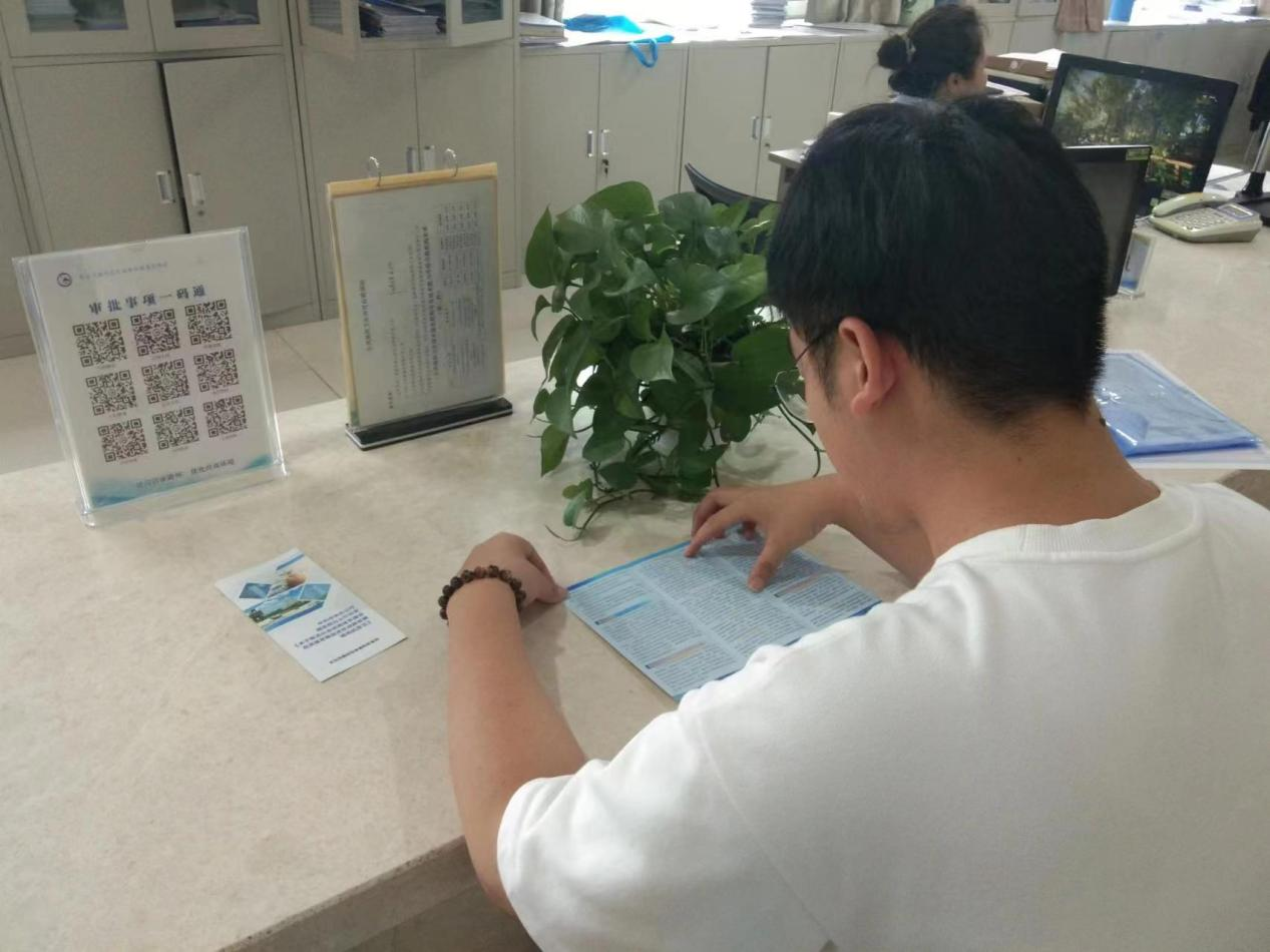 潞州区审批局开展诚信宣传活动,群众在潞州区审批局办事窗口阅读信用宣传知识手册。