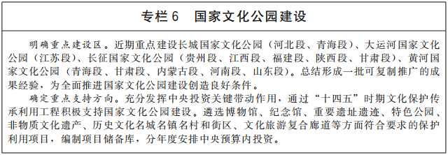 推进国家文化公园建设,生动呈现中华文化的独特创造、价值理念和鲜明特色,树立和突出各民族共享的中华文化符号和中华民族形象,探索新时代文物和文化资源保护传承利用新路径,把国家文化公园建设成为传承中华文明的历史文化走廊、中华民族共同精神家园、提升人民生活品质的文化和旅游体验空间。加快建设长城、大运河、长征、黄河等国家文化公园,整合具有突出意义、重要影响、重大主题的文物和文化资源,重点建设管控保护、主题展示、文旅融合、传统利用四类主体功能区,实施保护传承、研究发掘、环境配套、文旅融合、数字再现五大工程,突出“万里长城”、“千年运河”、“二万五千里长征”、“九曲黄河”整体辨识度。推进优质文化旅游资源一体化开发,科学规划、开发文化旅游产品和商品。推出参观游览联程联运经典线路,开展整体品牌塑造和营销推介。