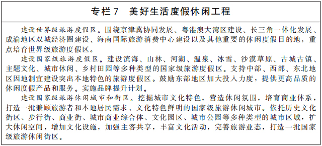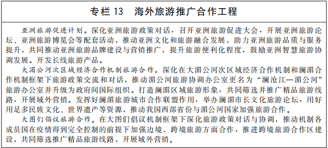 推进粤港澳大湾区旅游一体化发展,提升大湾区旅游业整体竞争力,打造世界级旅游目的地。深化港澳与内地旅游业合作,创新粤港澳区域旅游合作协调机制,推动资源共享。支持香港旅游业繁荣发展,加强内地与香港旅游业在客源互送、宣传营销等方面合作。支持香港发展中外文化艺术交流中心。推动澳门世界旅游休闲中心建设,支持澳门举办世界旅游经济论坛、国际旅游(产业)博览会等,打造以中华文化为主流、多元文化共存的交流合作基地。支持港澳青少年赴内地进行游学交流活动。推进海峡两岸乡村旅游、旅游创意产品开发等领域合作,探索海峡两岸旅游融合发展新路,让旅游成为增进中华文化认同、增强中华民族凝聚力的有效途径。