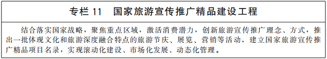 创新国内旅游宣传推广体制机制,推进现代化、市场化、专业化运营。支持建设一批旅游营销创新基地,孵化一批具有较高传播力和影响力的旅游品牌。推动旅游宣传推广与城市经济发展、节庆品牌塑造、商务环境改善等互动发展和一体发展。创新办好中国旅游产业博览会、中国(武汉)文化旅游博览会、中国义乌文化和旅游产品交易博览会、中国体育旅游博览会、中国森林旅游节。加强新媒体宣传推广,推动跨区域旅游创新协同和支持机制建设,实施旅游宣传推广联盟示范建设专项行动。