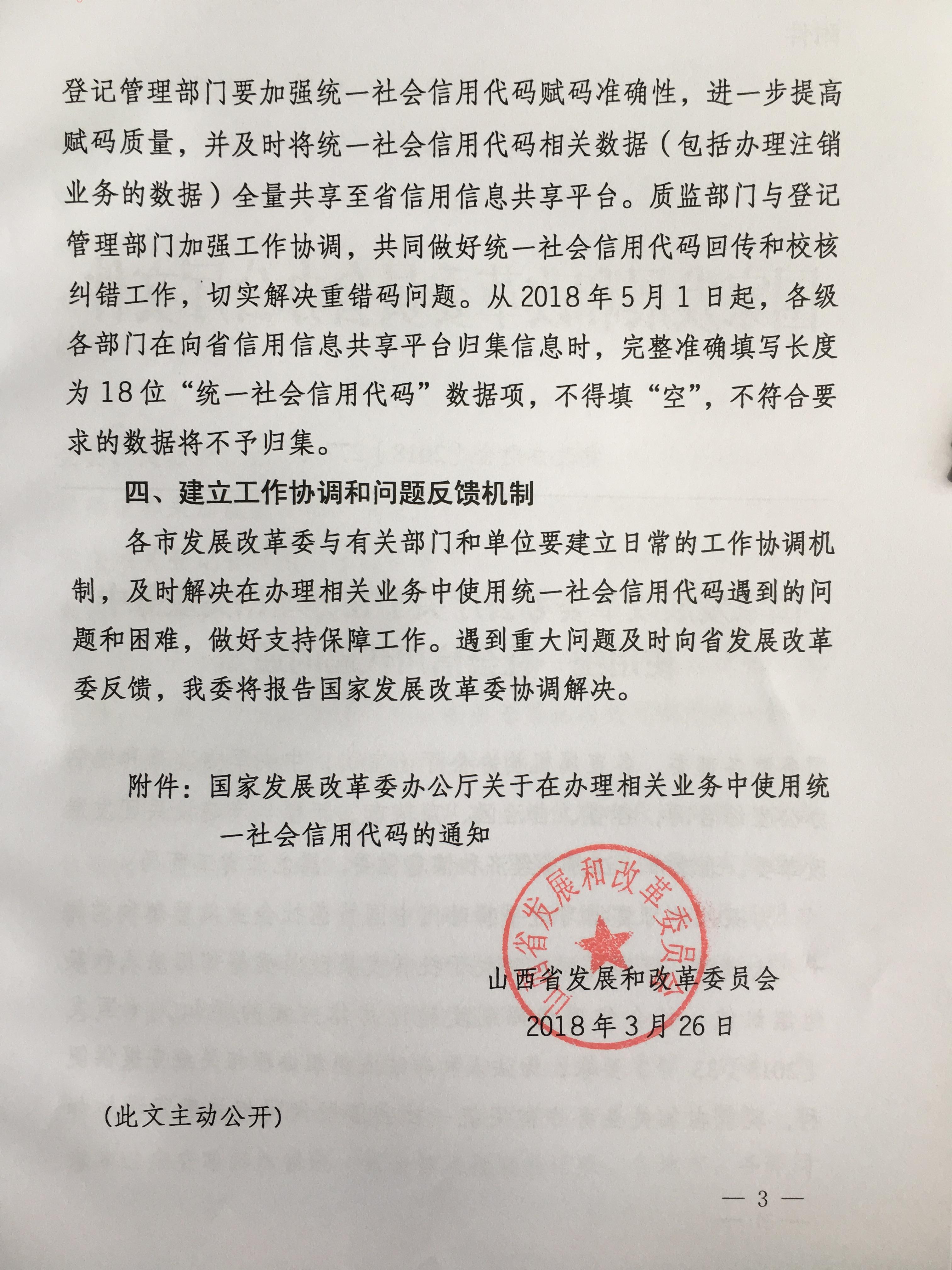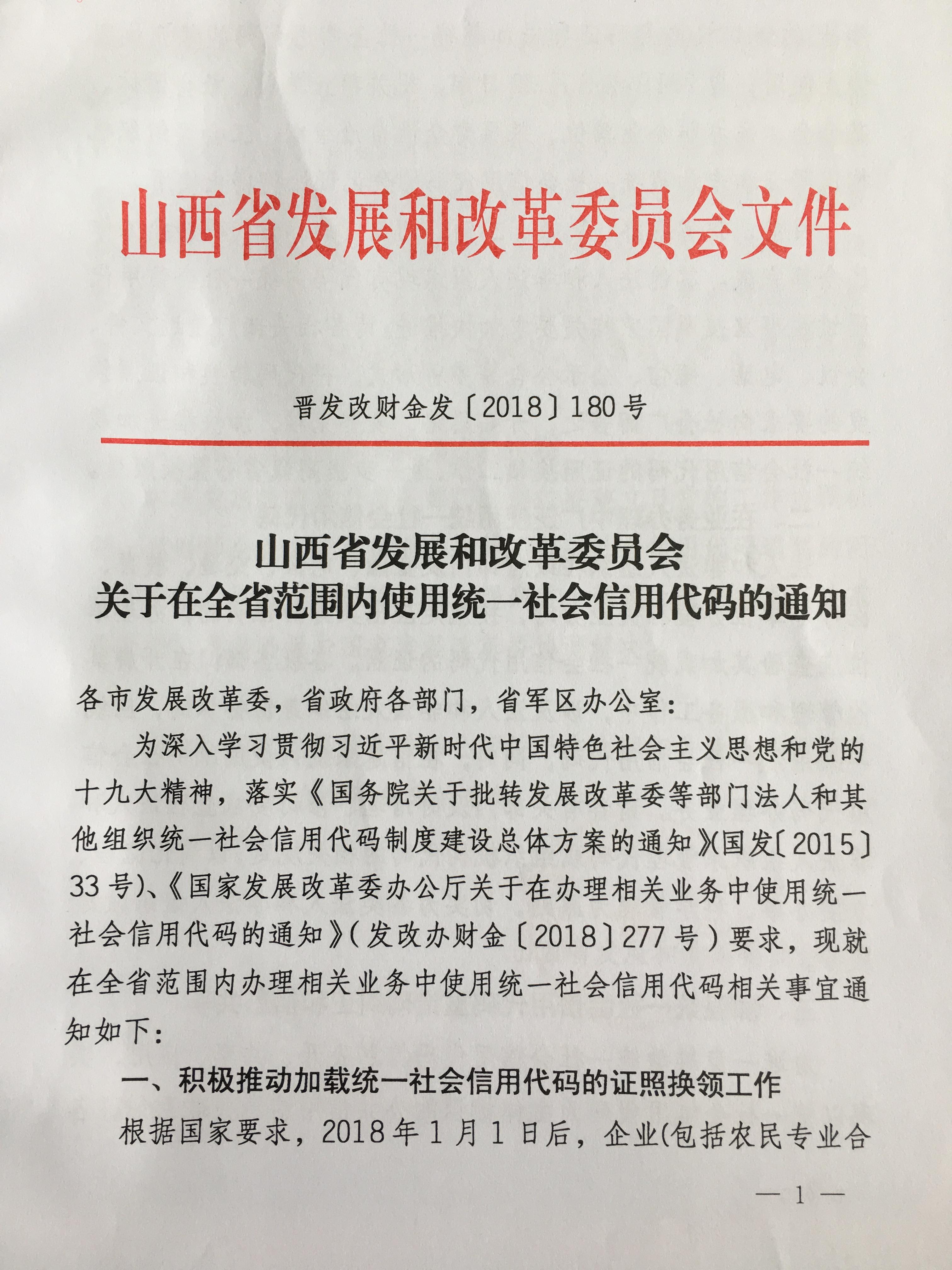 山西省发展和改革委员会关于在全省范围内使用统一社会信用代码的通知