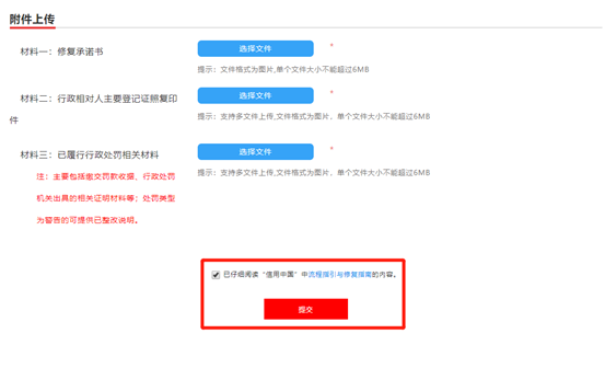5.    最后勾选已仔细阅读“信用中国”中流程指引与信用修复指南的内容框,点击提交。