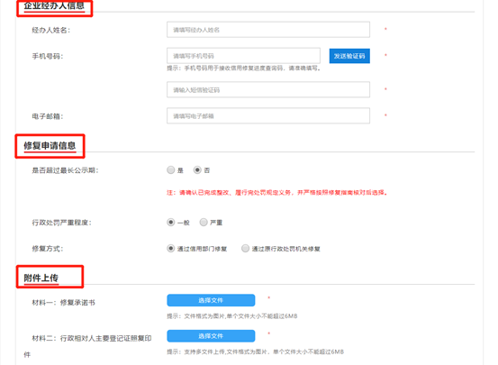 输入企业经办人信息;选择修复申请信息;上传各项材料。