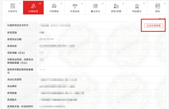 3.    选择需要申请信用修复的行政处罚信息,点击右上角在线申请修复。
