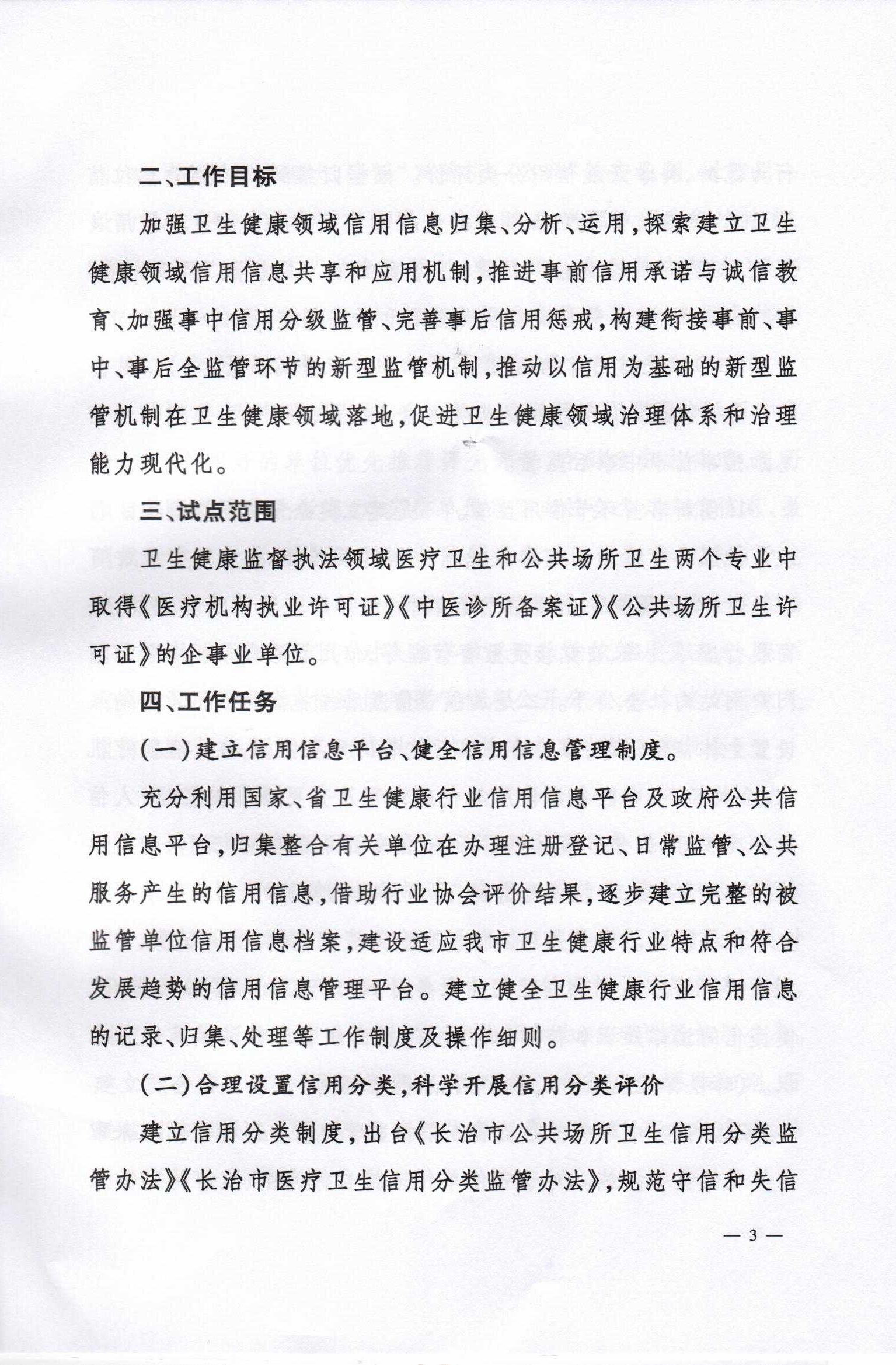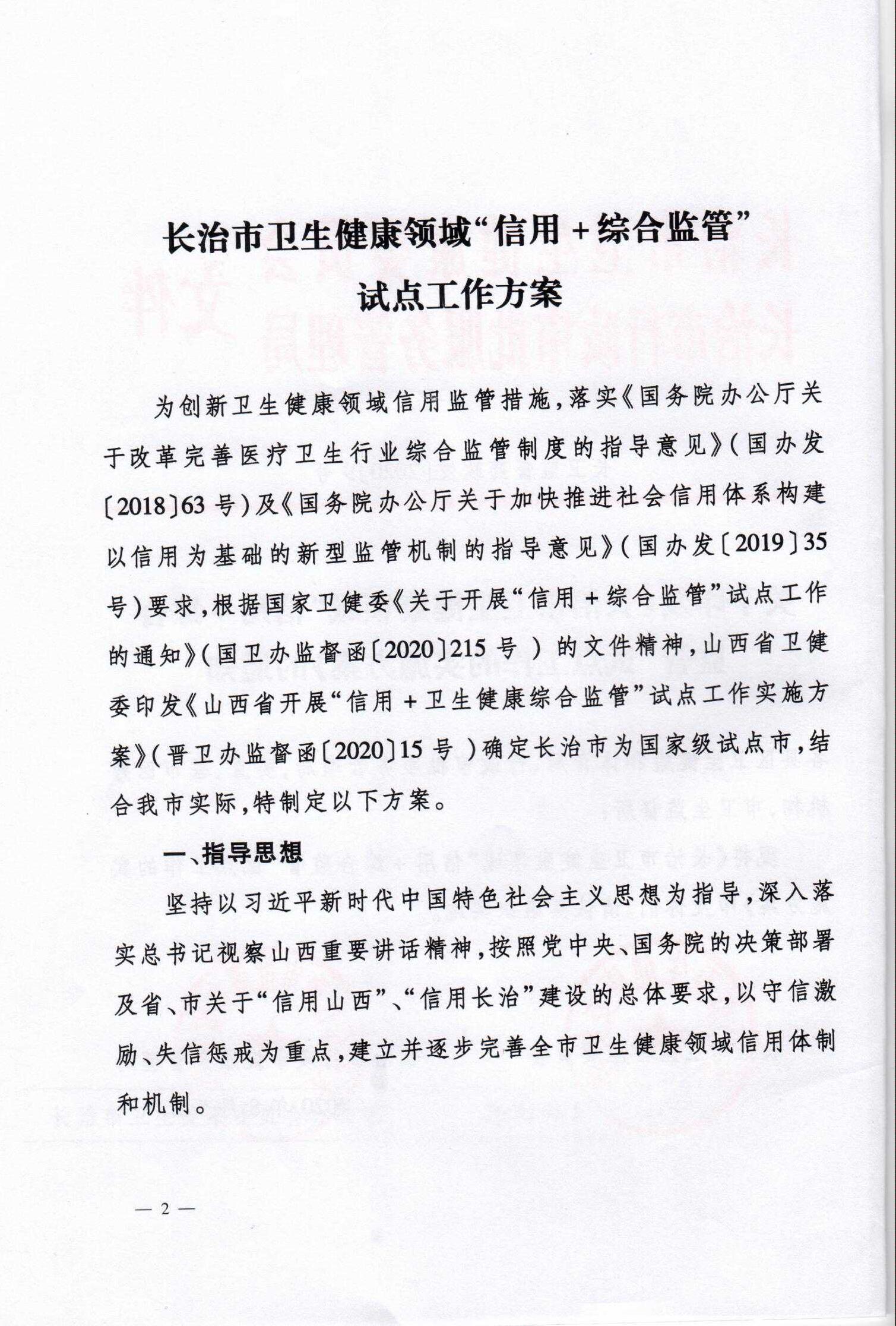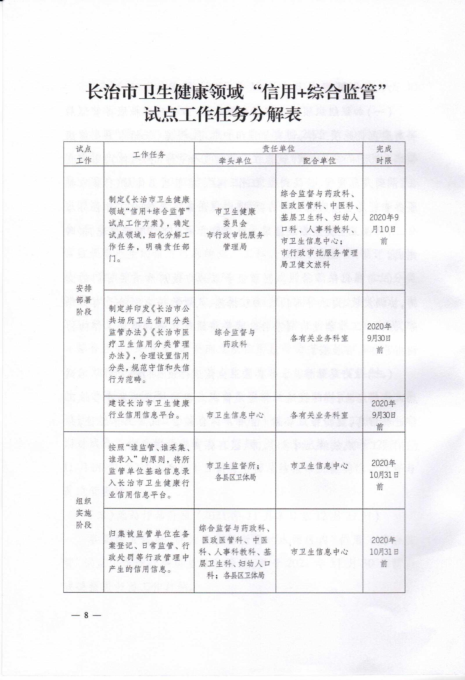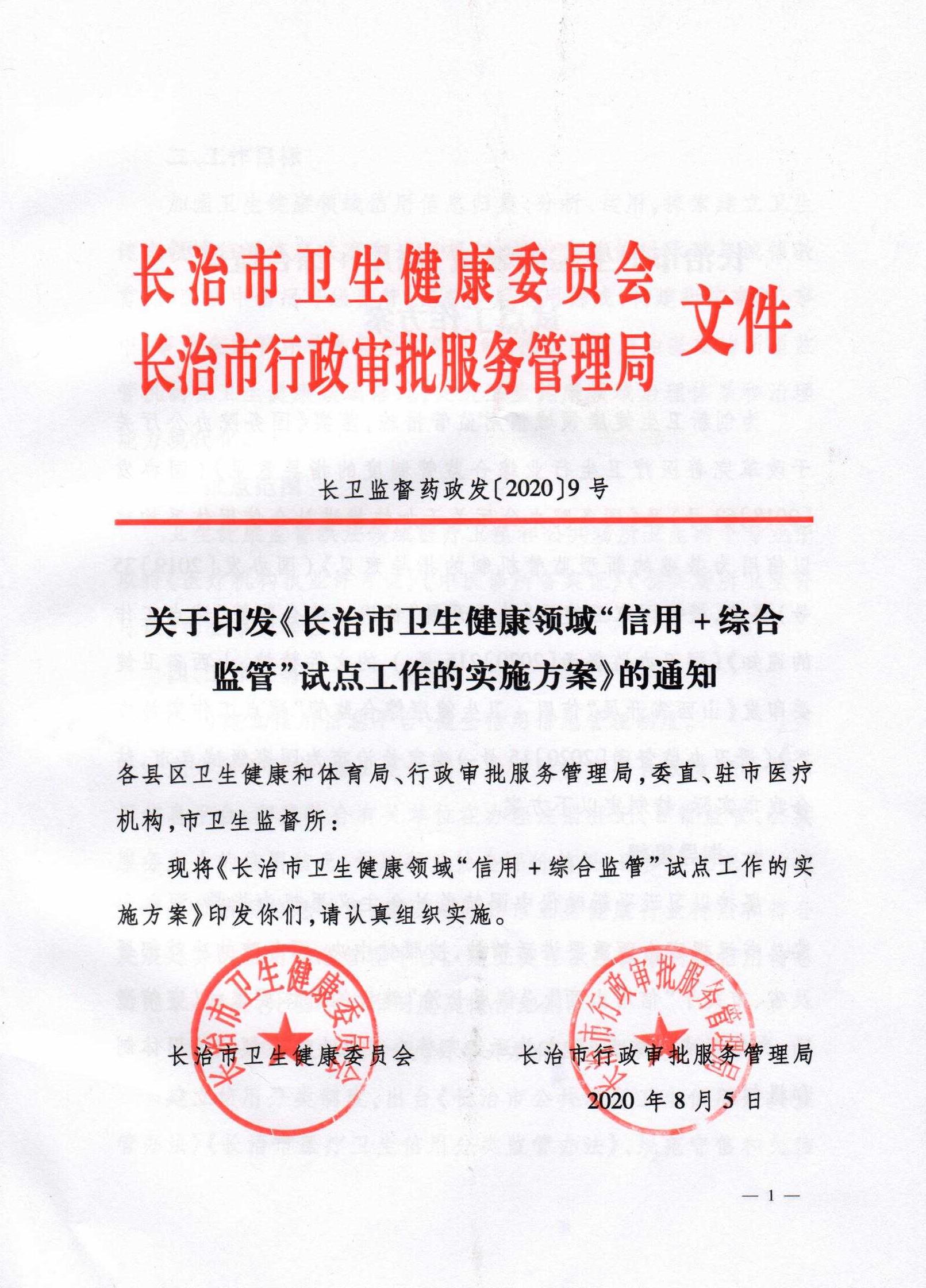 长治市卫生健康委员会 长治市行政审批服务管理局关于印发《长治市卫生健康领域“信用+综合监管”试点工作的实施方案》的通知