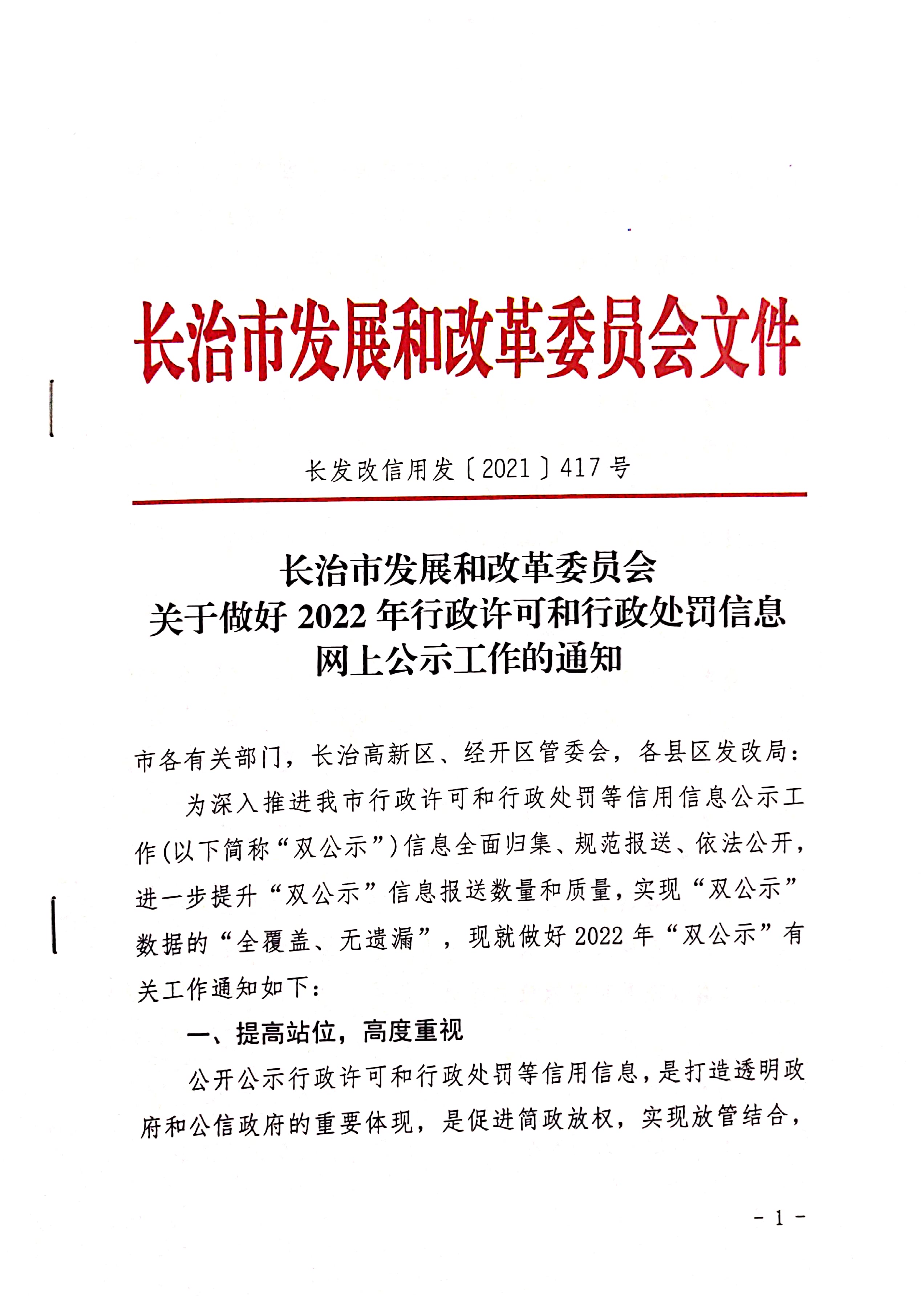 关于做好2022年行政许可和行政处罚信息网上公示工作的通知 (长发改信用发〔2021〕417号)