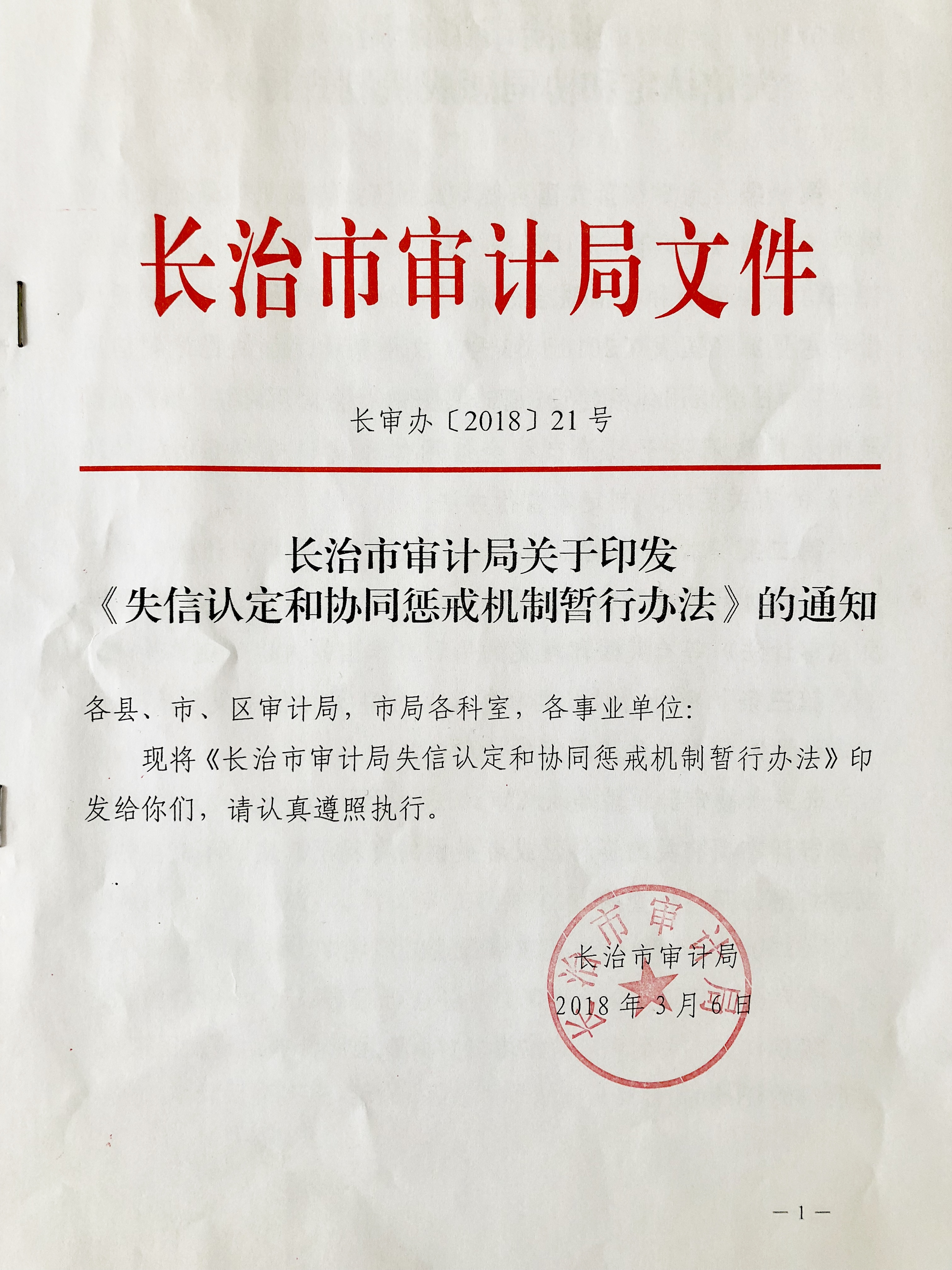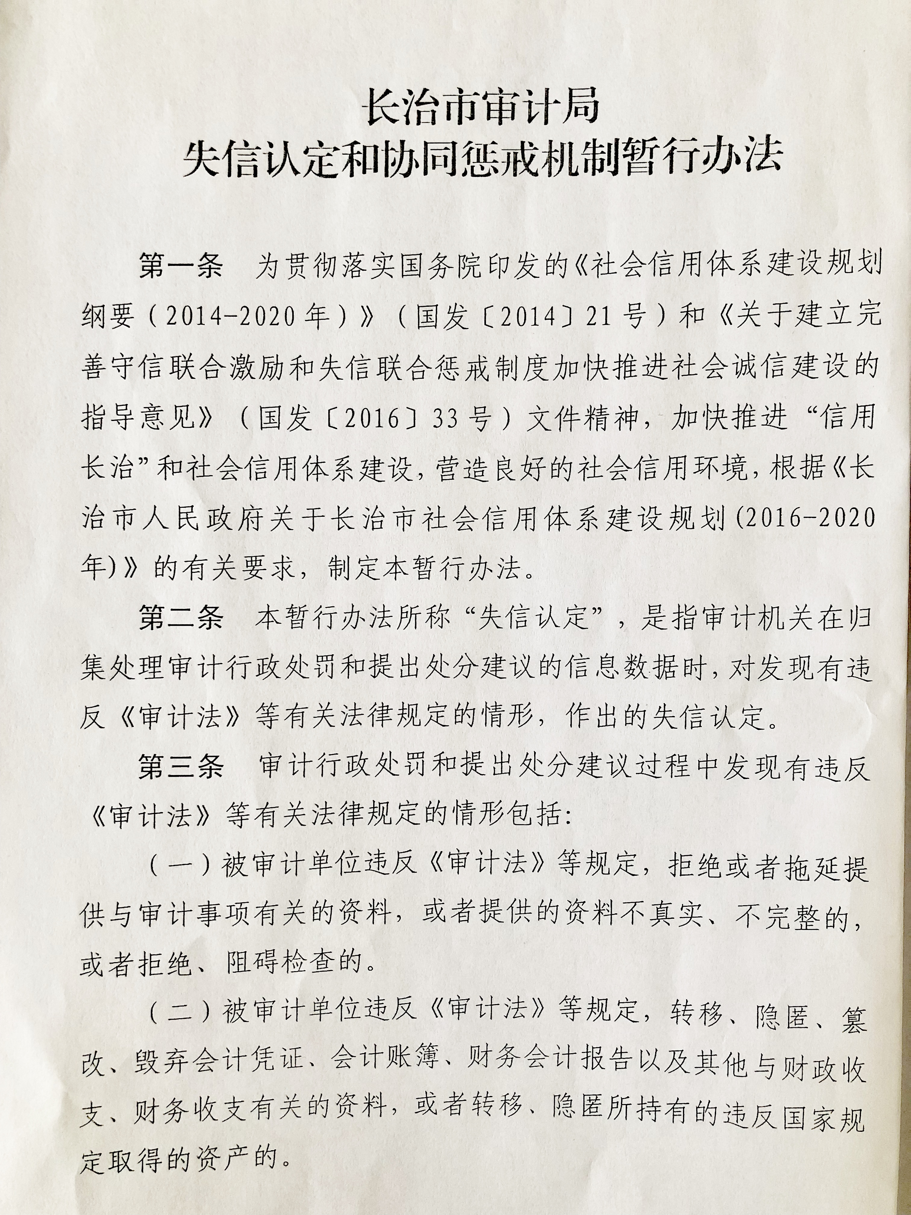 长治市审计局关于印发《失信认定和协同惩戒机制暂行办法》的通知