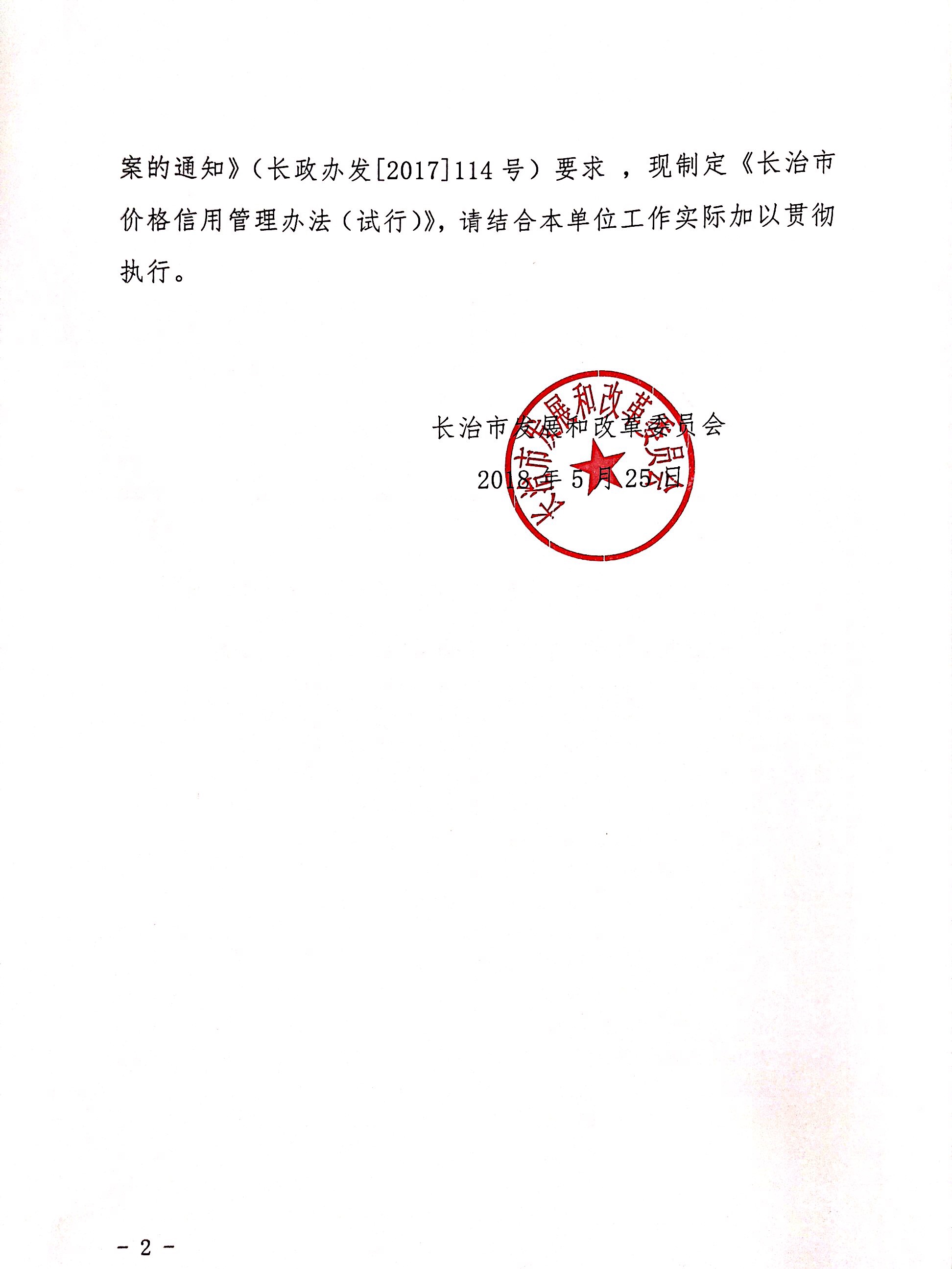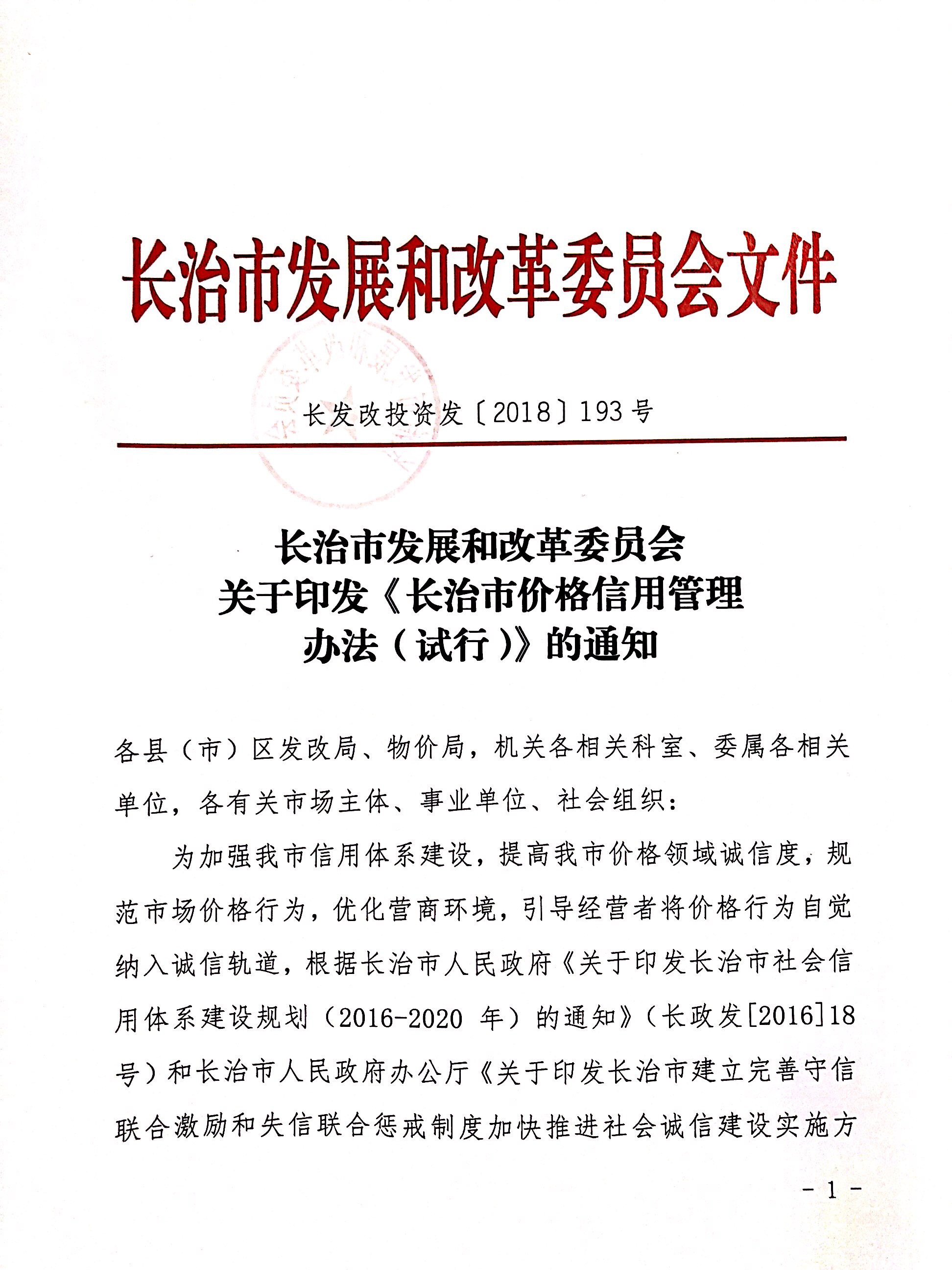 长治市发展和改革委员会关于印发《长治市价格信用管理办法(试行)》的通知